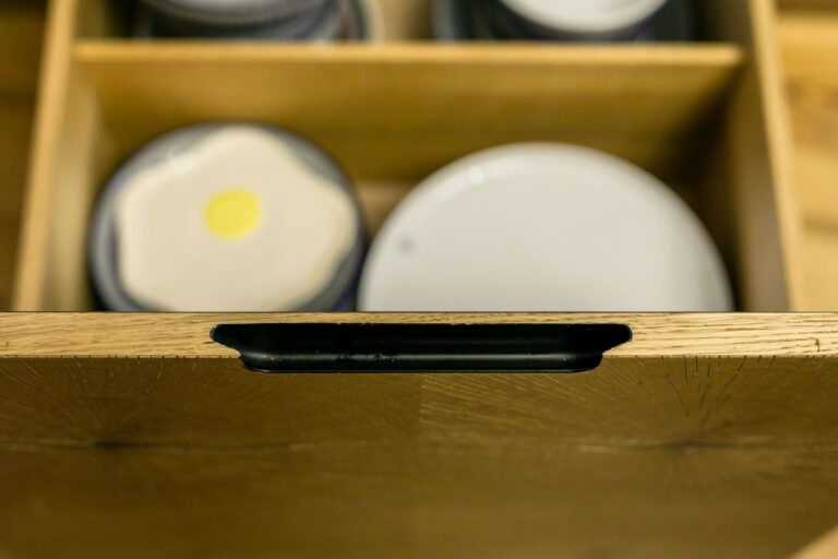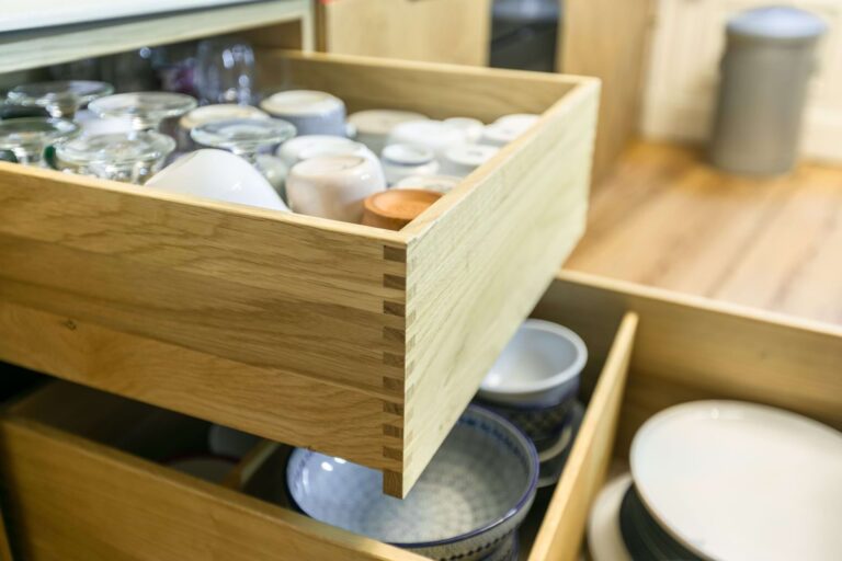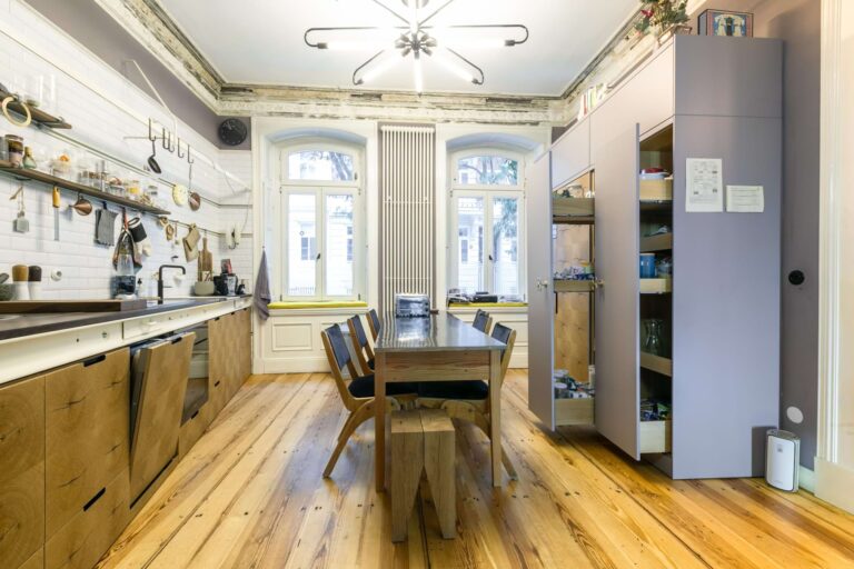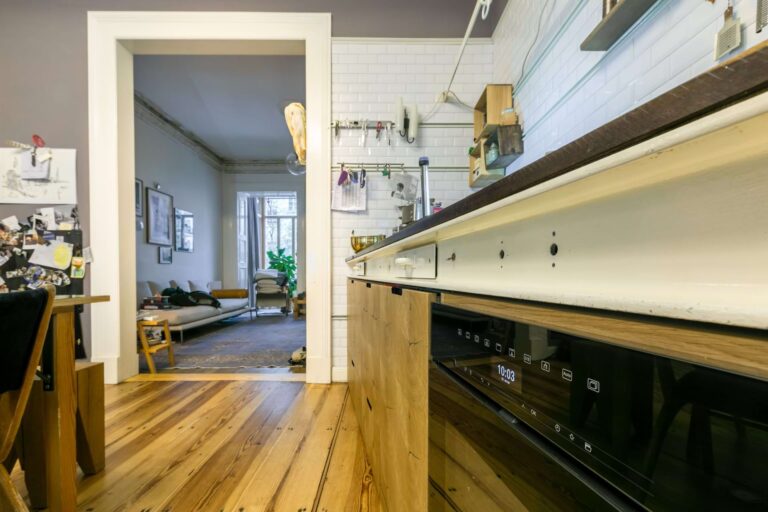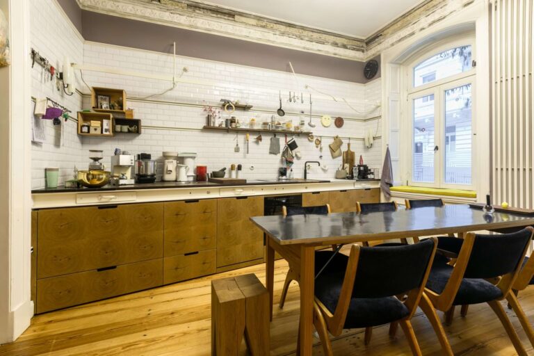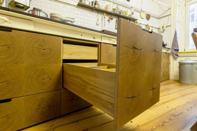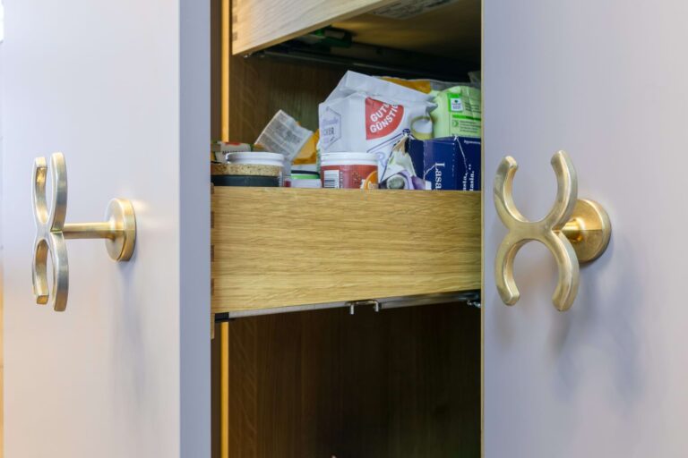 Im zweiten Bauabschnitt kam der gegenüberliegende Küchenblock hinzu. Wir bringen Farbe ins Spiel und Griffe aus dem Fundus der Familie. Die Aufteilung ist klar gegliedert und ein großer, selbstentwickelter Apothekerschrank sorgt für noch mehr Stauraum.