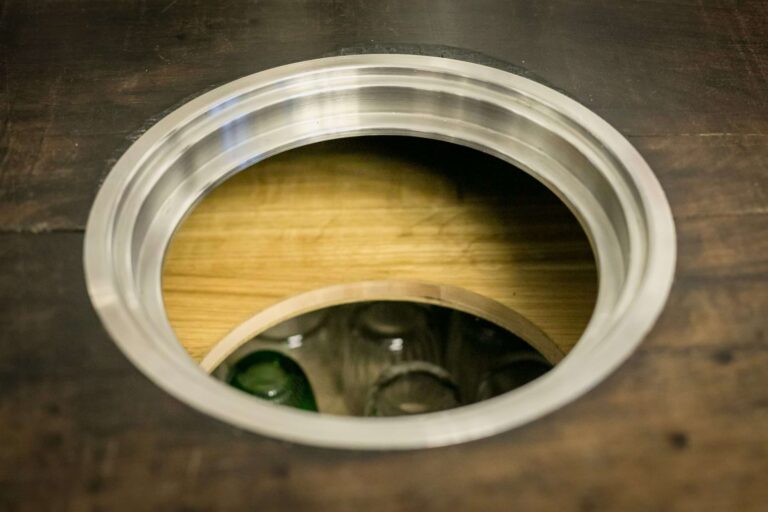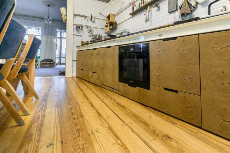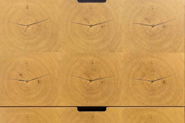 Wir haben in drei Bauabschnitten die Küche neu definiert. Im ersten Bauabschnitt haben wir die lange Küchenzeile im Bestand integriert. Der vorhandene Doppel-T-Träger und die trapezförmige Arbeitsplatte (aus Ironwood) wurden erhalten. Die Möbelfronten sind der absolute Blickfang, ein individuell gefügtes Hirnholzfurnier aus Eiche, mit der Silhouette von davonfliegenden Vögeln. Dies war der erste Gedanke vom Sohn des Bauherren – wie recht er hat.