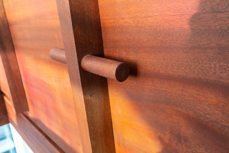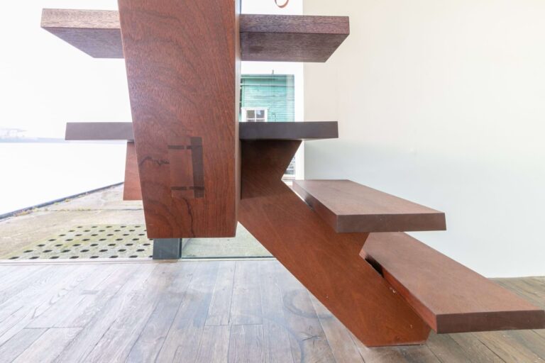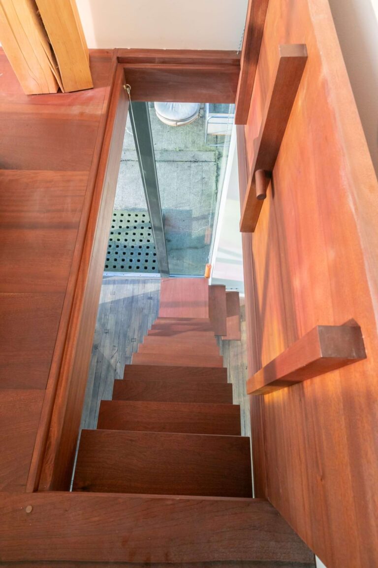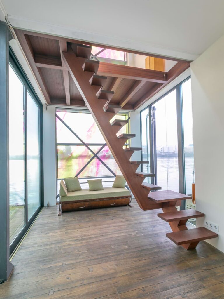 Unser Kunde hat ein modernes, aus Containern und Einbauten bestehendes Feriendomizil, direkt an der Elbe. Für ihn haben wir auch einen imposanten Eingangsbereich gestaltet – siehe die Story „Vom Öffnen zum Sein“. Wir haben in dem Wohn-Container-Konstrukt gemeinsam mit dem Architekten Stephen Perry lange überlegt, wie wir in dem Raum eine erreichbare Ebene einziehen können. Eine gestalterische Vorgabe sah vor, die Anmutung japanisch leicht wirken zu lassen. Das Ergebnis spiegelt auf eindrückliche Weise die intensive Auseinandersetzung mit dem Anforderungsprofil wieder. Eine handwerklich äußerst filigrane Konstruktion schafft genügend Platz in dem Raum, so dass die Sicht und der Bewegungsradius nicht eingeschränkt werden. Eine viertelgewendelte Mono-Wangen-Treppe, frei aufgehängt, führt hinauf zum Schlafbereich. Eine Bodenluke lässt sich spielerisch öffnen, ein exakt austarierter Flaschenzug unterstützt die Funktion, die Gestaltung des Griffes nimmt den japanischen Ansatz der Reduktion auf.