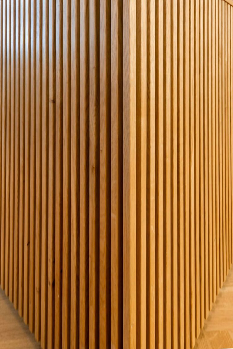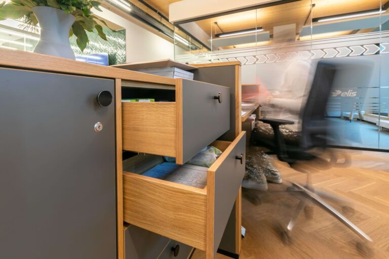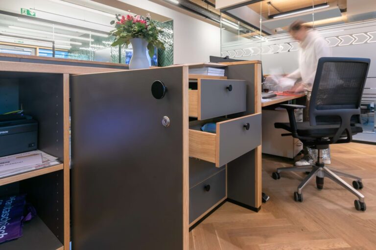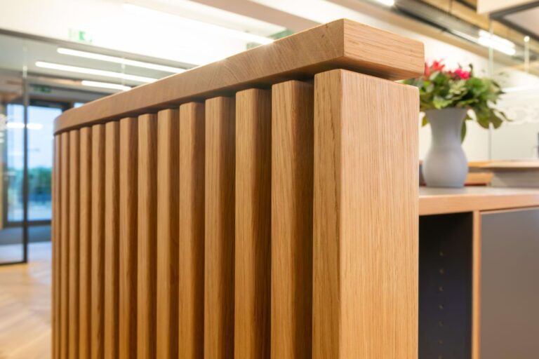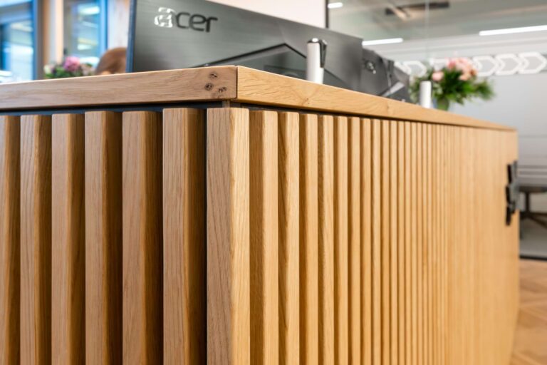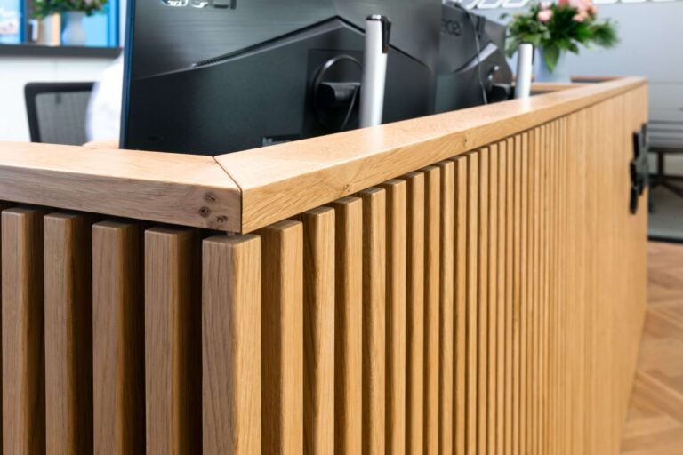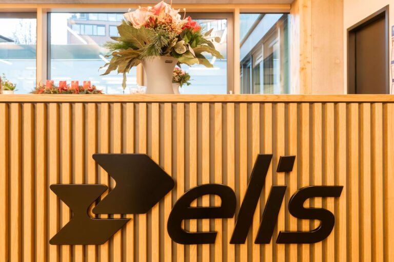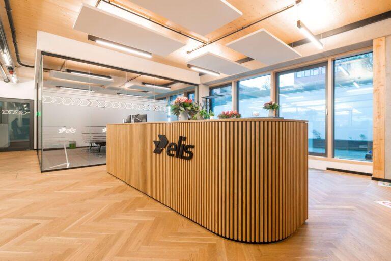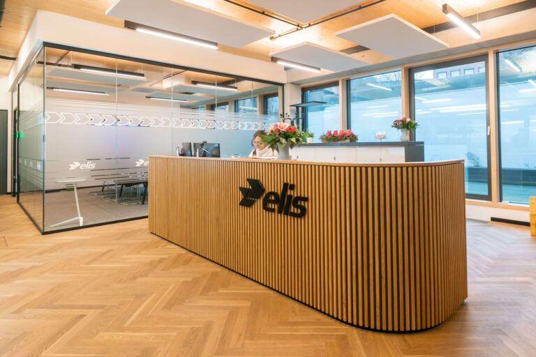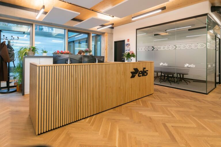 Elis ist eine bundesweit tätige Firma mit Sitz in Hamburg-Bahrenfeld, die Unternehmen mit frischer Arbeitskleidung versorgt. Wir haben den Empfangsbereich und den Arbeitsplatz mit einer neuen Tresenanlage ausgestattet. Die aufgesetzten Eichenstreben bilden das Hauptaugenmerk der Gestaltung. Die filigrane Anordnung gliedert die Front und setzt sich auf der Rundung rechts fort. Der Arbeitsbereich ist ergonomisch mit einer höhenverstellbaren Arbeitsfläche vorgesehen.