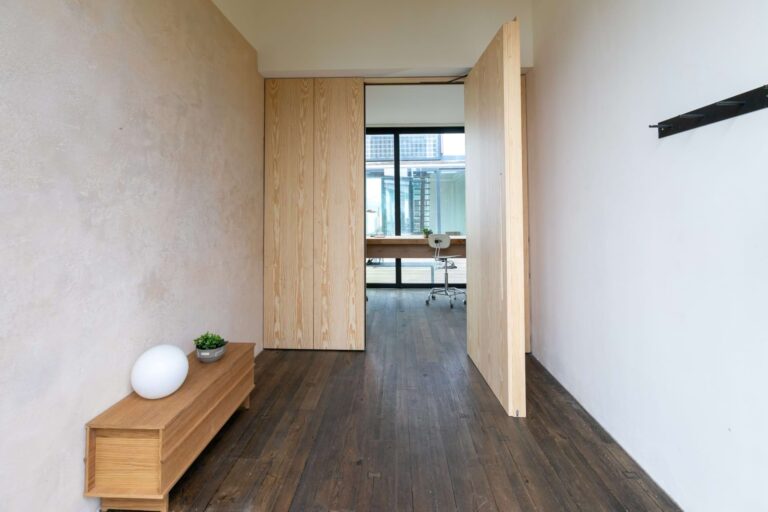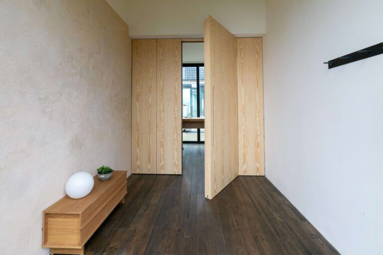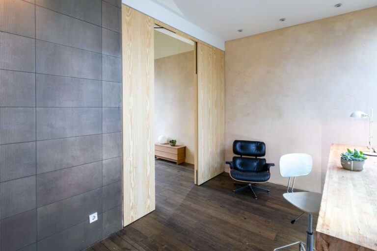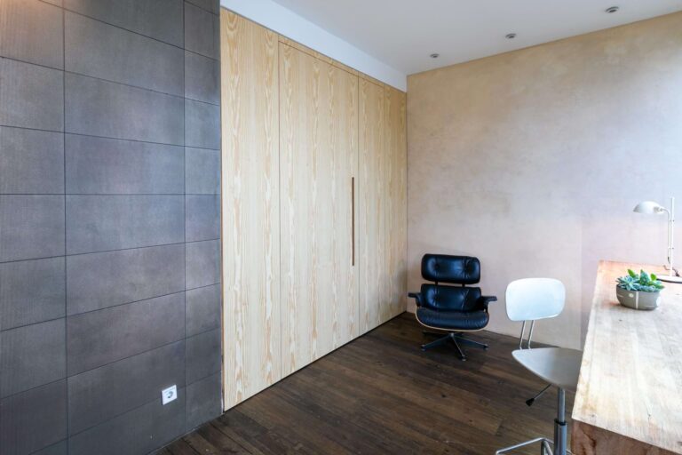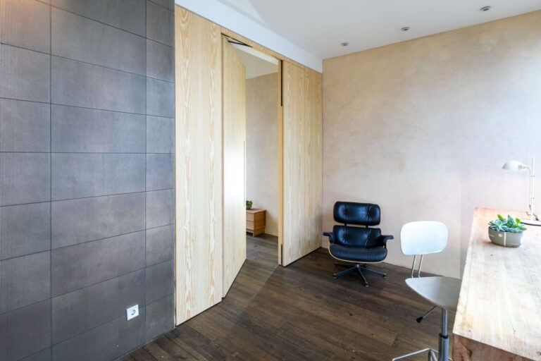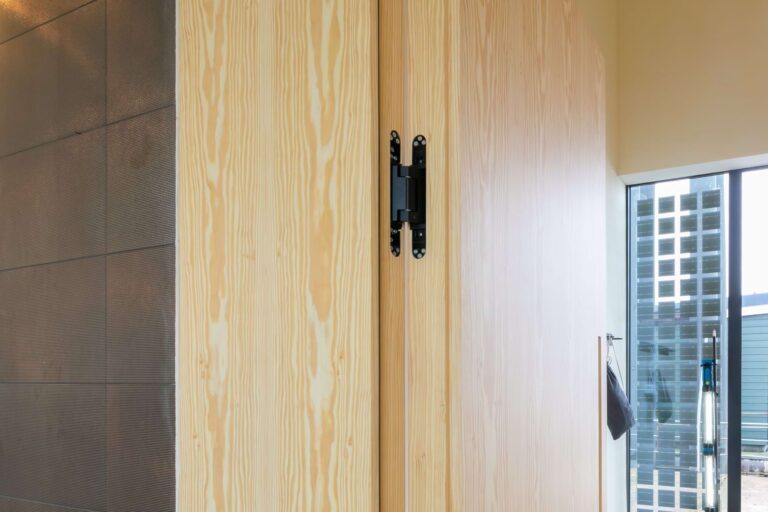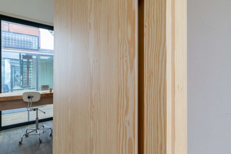 Für unseren Kunden, der ein stylisches Wochenendhaus aus Containern und Einbauelementen direkt an der Elbe besitzt, haben wir eindrucksvoll den Eingangsbereich vom Wohnraum separiert – bildlich und energetisch. Das Wand-Tür-Element besticht durch seine klare Formensprache, flächig, mit einem Furnierbild aus Oregon Pine, quasi „one of a Kind“. Die Konstruktion ist technisch auf ein Maximum der Machbarkeit ausgereizt – OHNE Kompromisse. Eine doppelflügelige Tür von 110 mm Wandungsstärke ist ein echtes Statement und ein Hingucker. Der integrierte Eingriff zeigt klar die Funktion an, das Aufziehen der Tür ist eine kleine Offenbarung – leicht und doch merkt man die Massivität des Elementes. Hier ist MEHR einfach mehr!